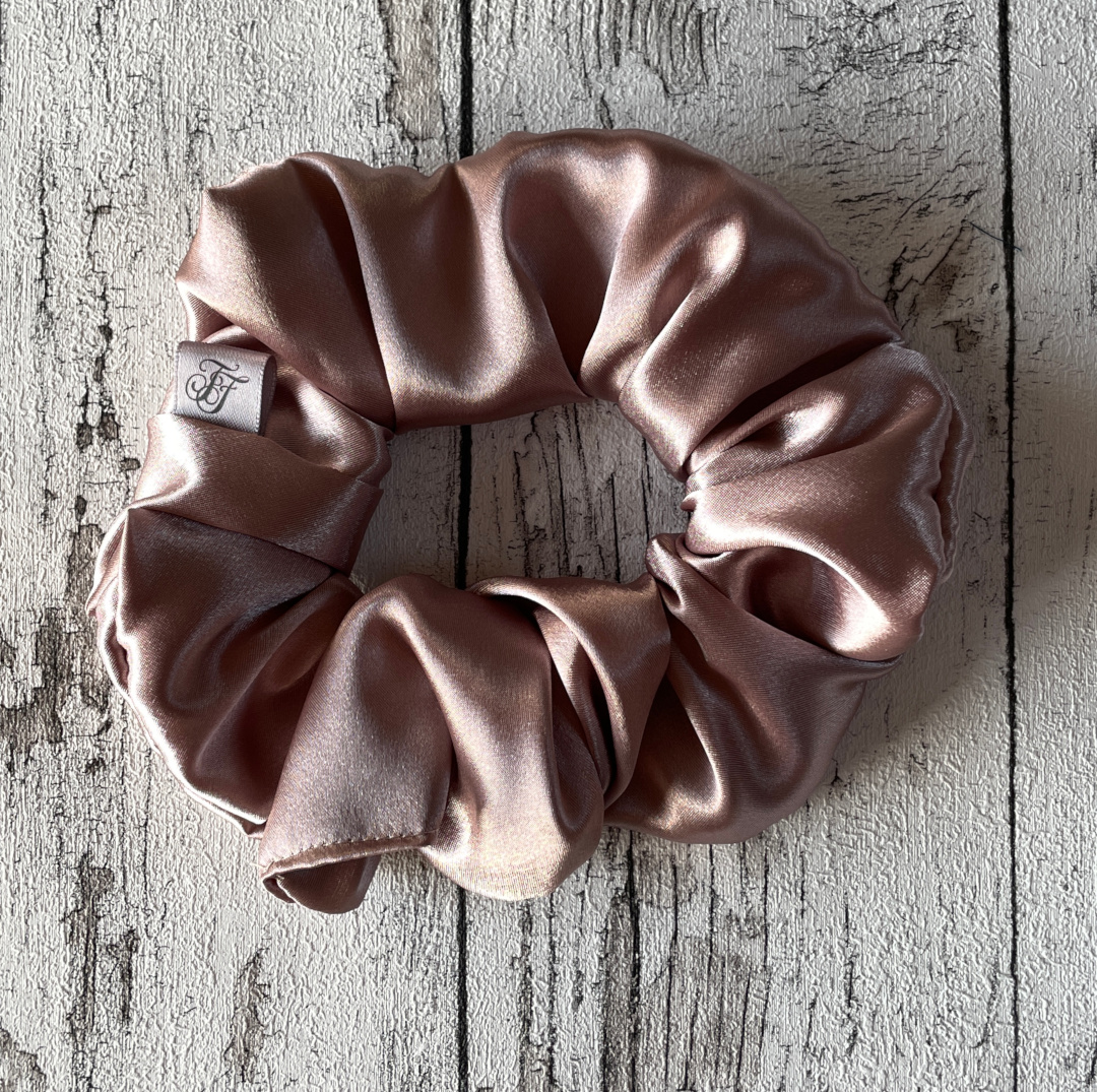 Mellemstørrelse scrunchie hårelastik syet i lækkert blankt satinstof.