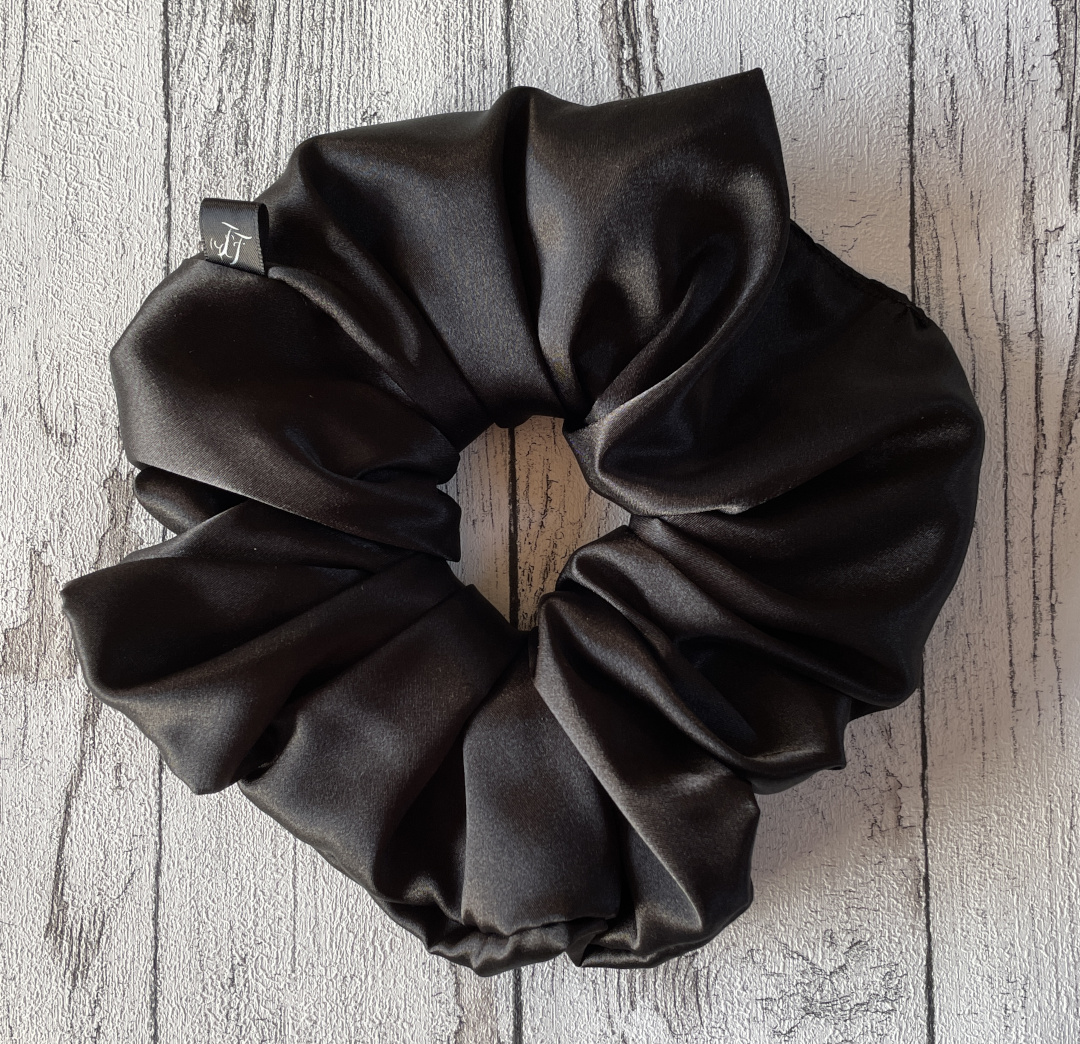 Stor sort scrunchie hårelastik syet i lækkert blankt satinstof.